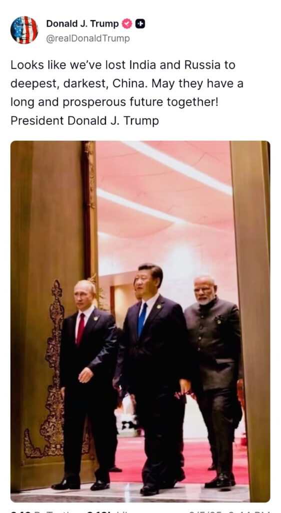 अमेरिकी राष्ट्रपति डोनाल्ड ट्रम्प ने शुक्रवार को अपनी सोशल मीडिया साइट ट्रुथ सोशल पर पोस्ट करते हुए दावा किया कि ऐसा लगता है भारत और रूस चीन के हाथों चले गए हैं। ट्रम्प ने साथ ही यह भी लिखा कि उम्मीद है उनका भविष्य अच्छा होगा।